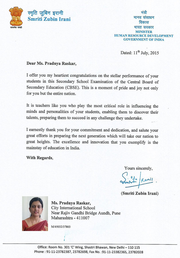 Our Principal, Mrs. Shilpa Gujare, was awarded the Avantika Pratibha Samman (2012).